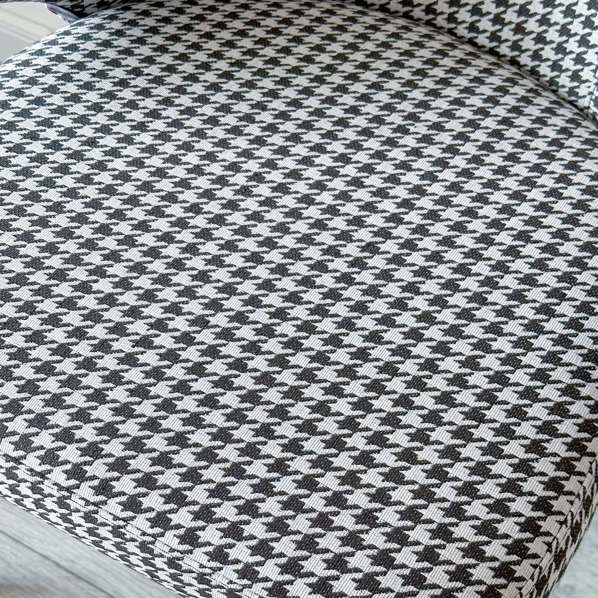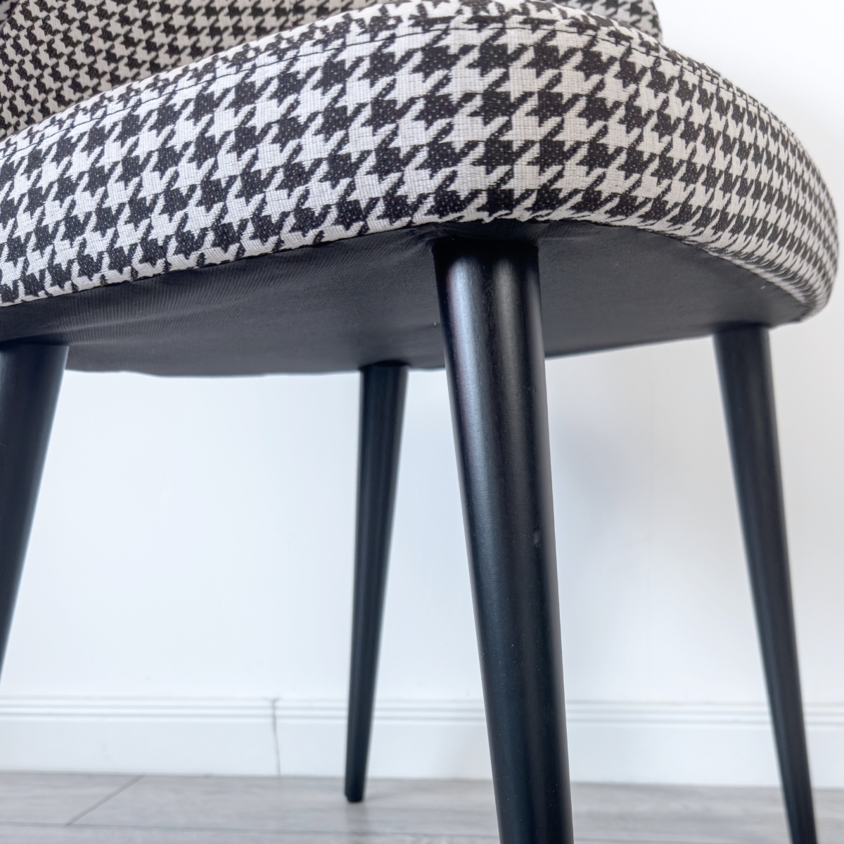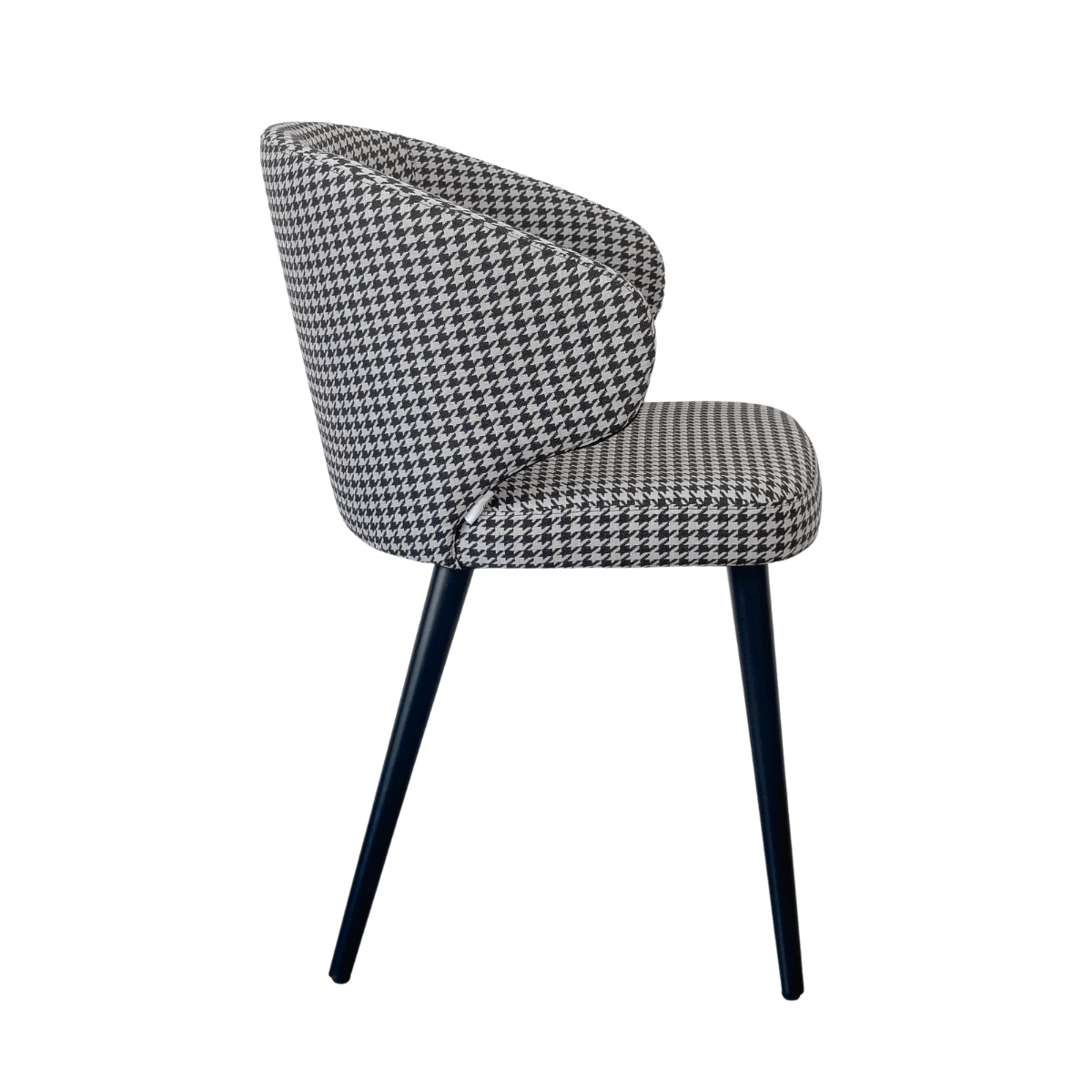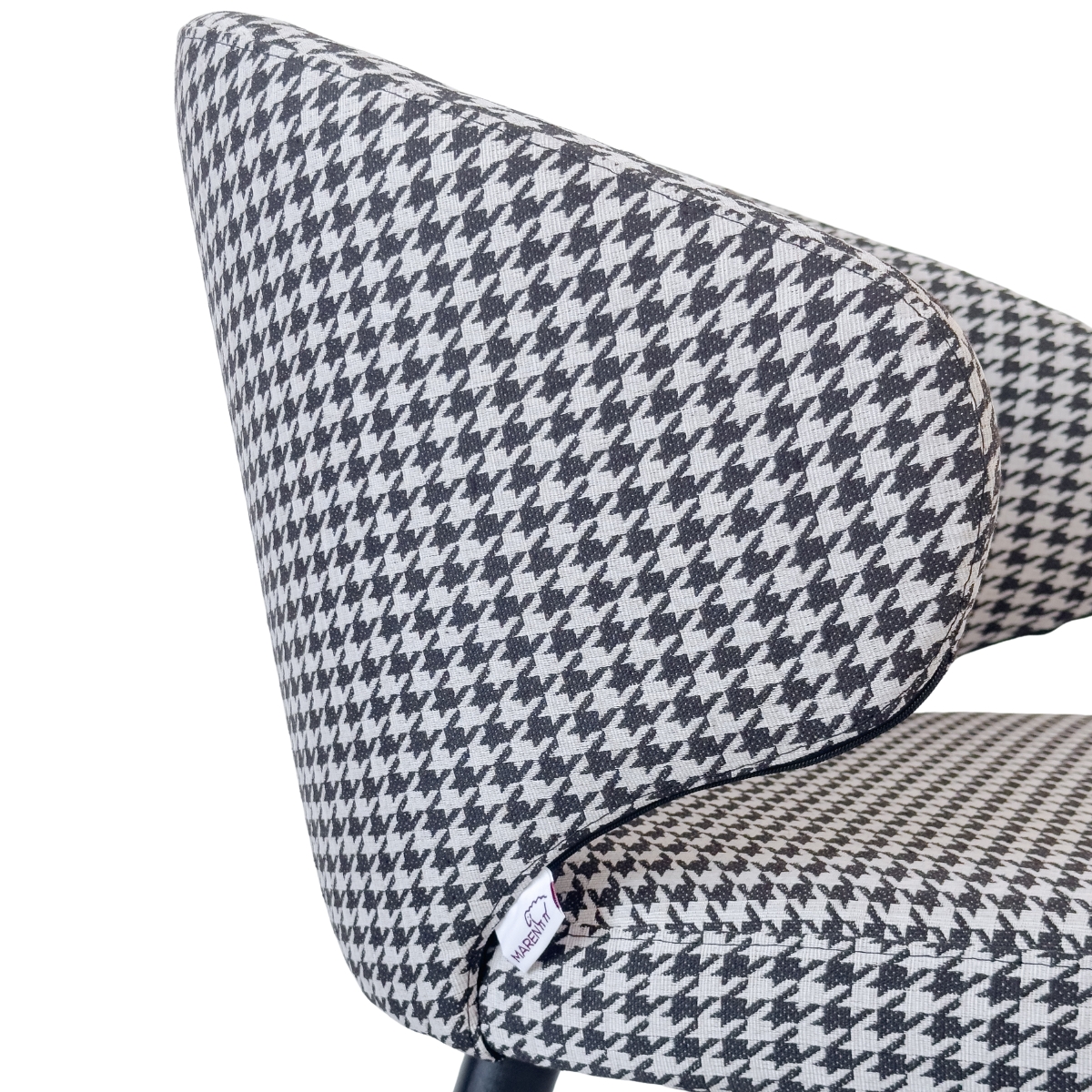 Scaunul ANA Classic are picioare din lemn masiv fag și este tapițat cu un material textil, de culoare alb-negru.