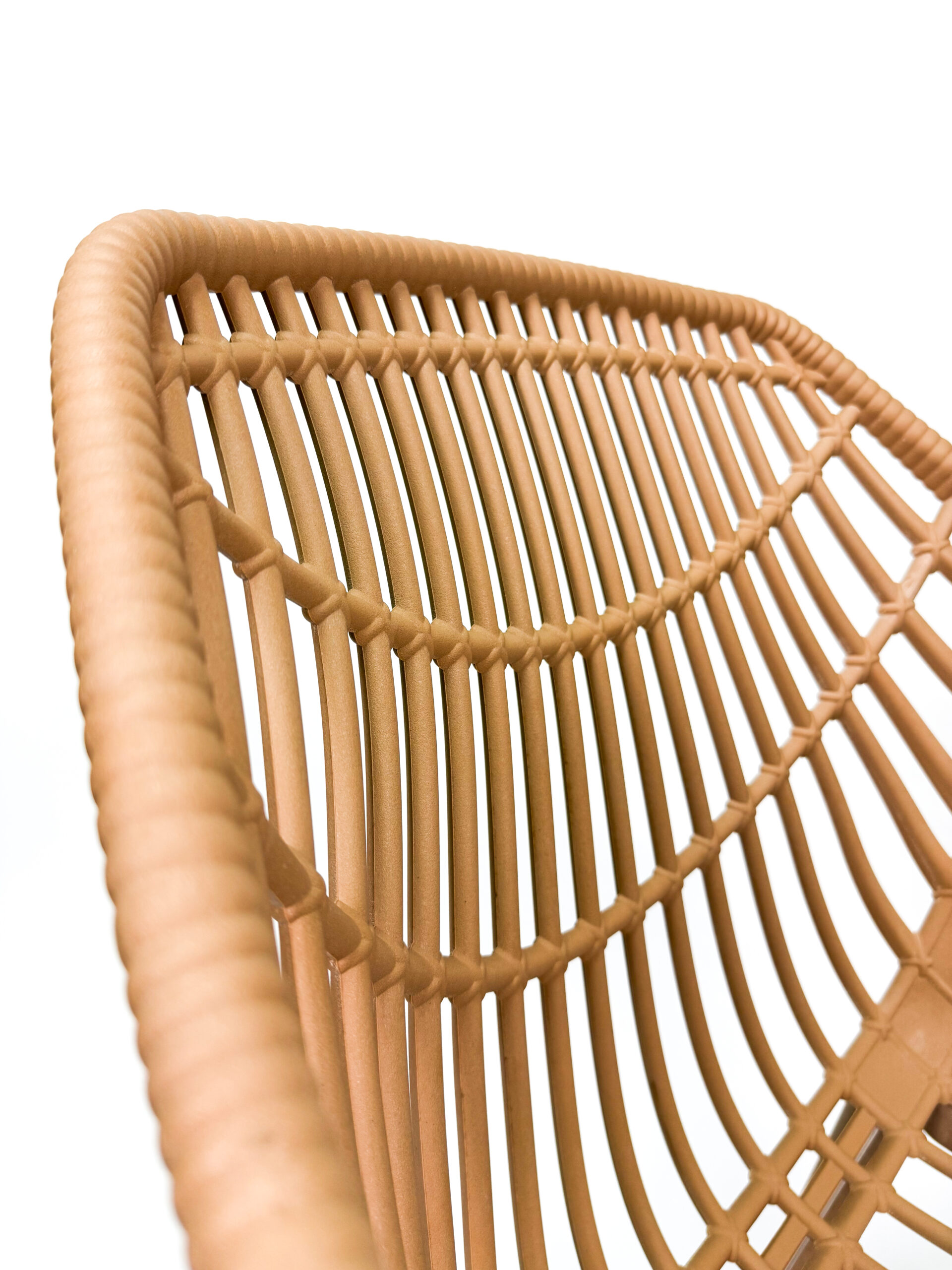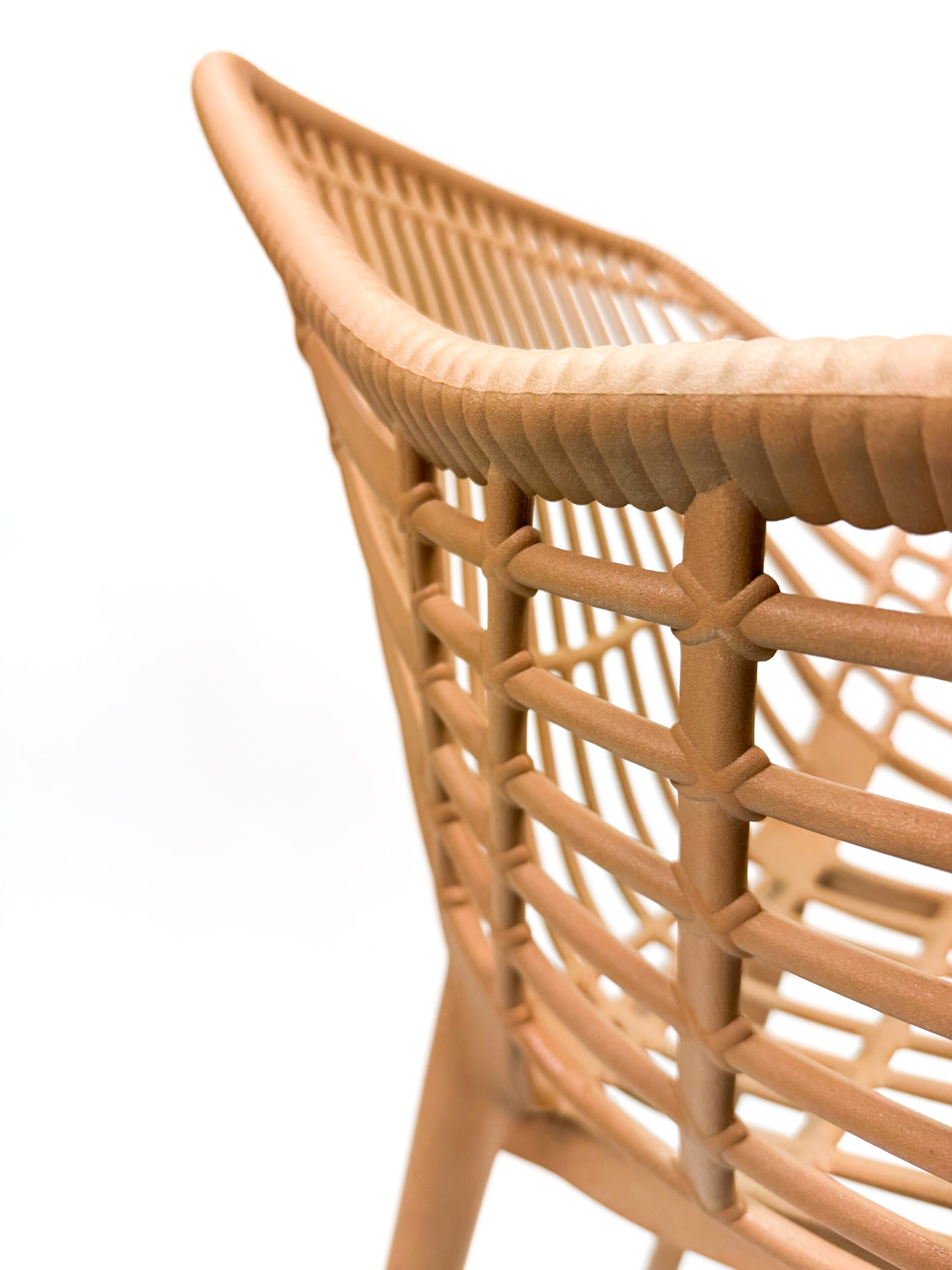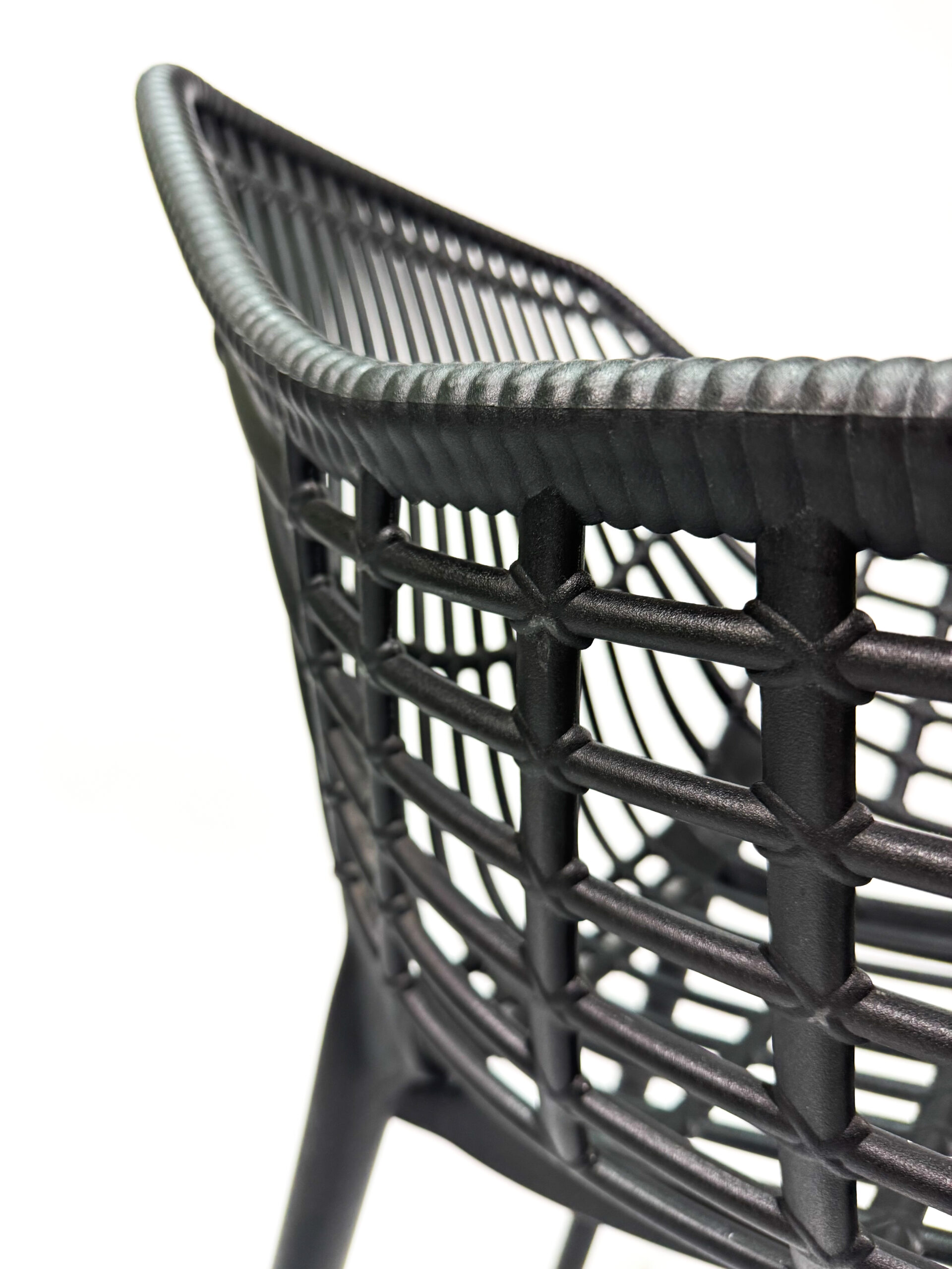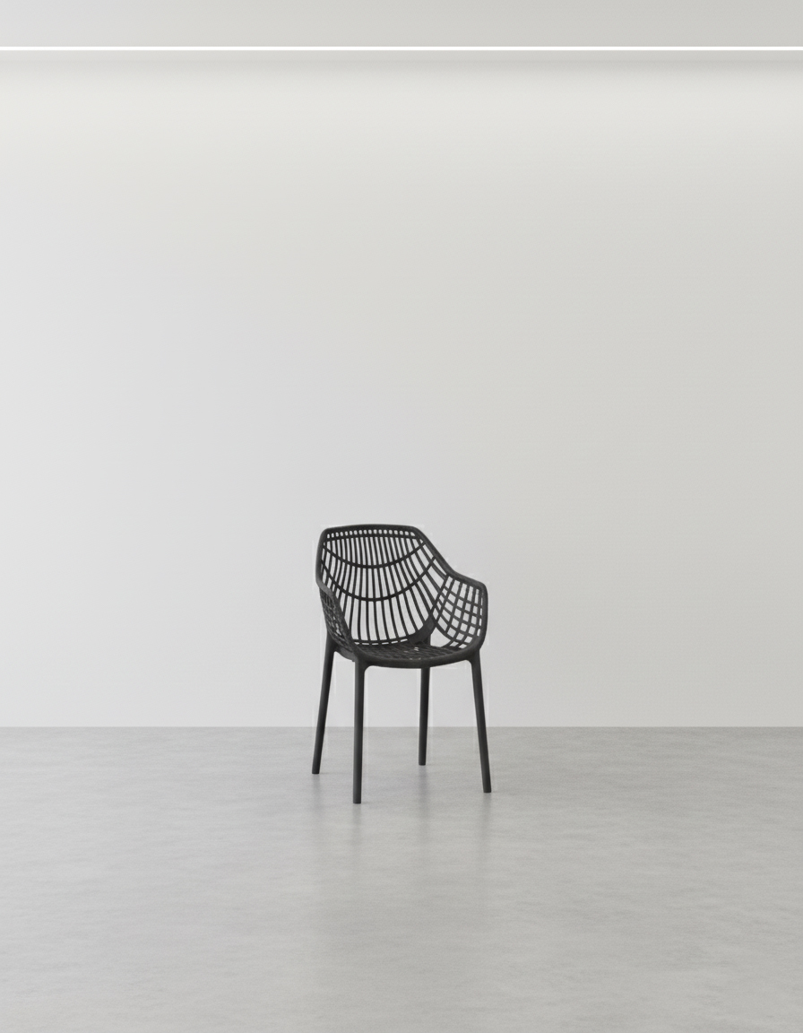 Spătarul curbat, cu structură tip plasă geometrică, oferă nu doar un aspect sofisticat, ci și un confort sporit, adaptându-se formei corpului. Liniile fluide și forma aerisită creează un efect vizual elegant și modern.