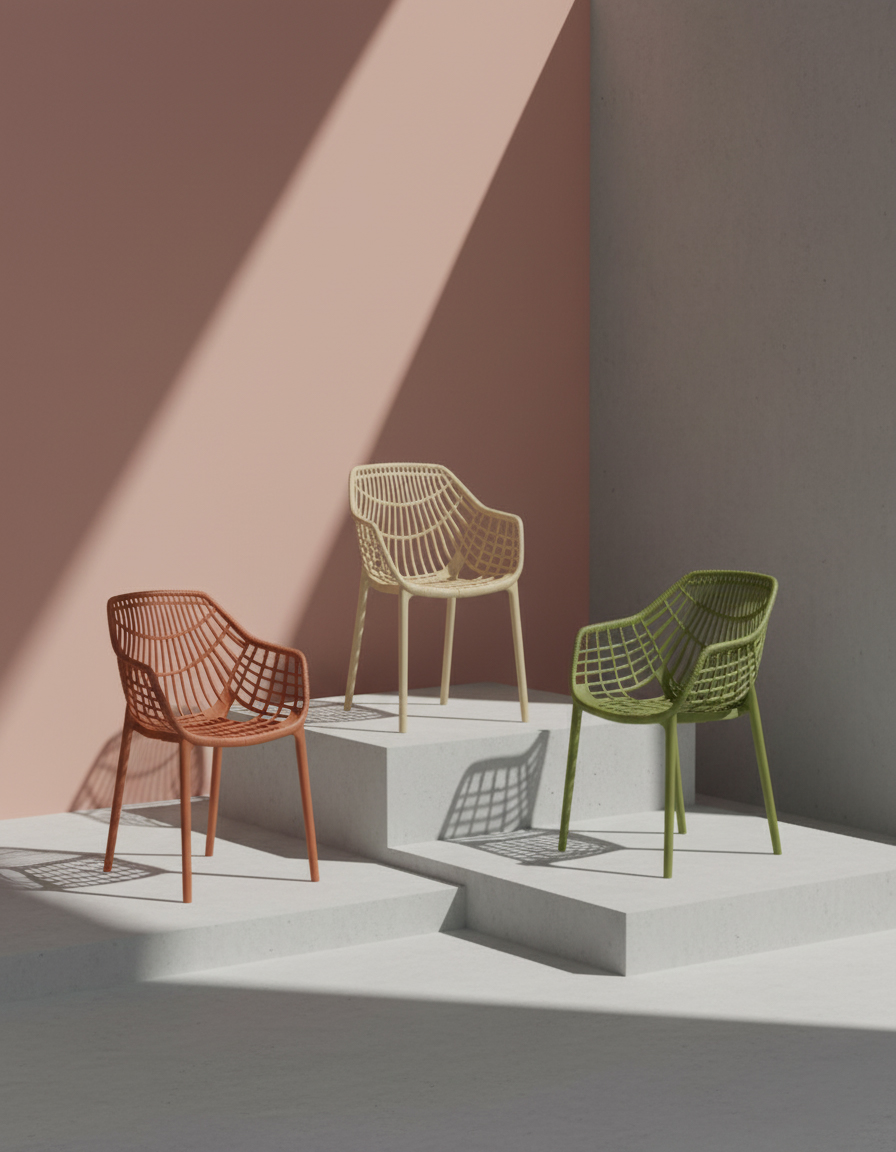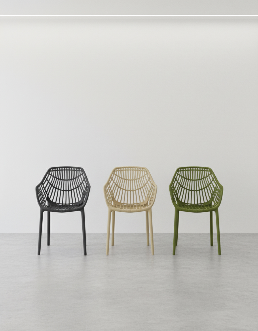 Fabricat din plastic de înaltă calitate (polipropilenă sau material similar), scaunul este rezistent la intemperii, raze UV și umiditate, fiind perfect pentru utilizare în aer liber pe termen lung.