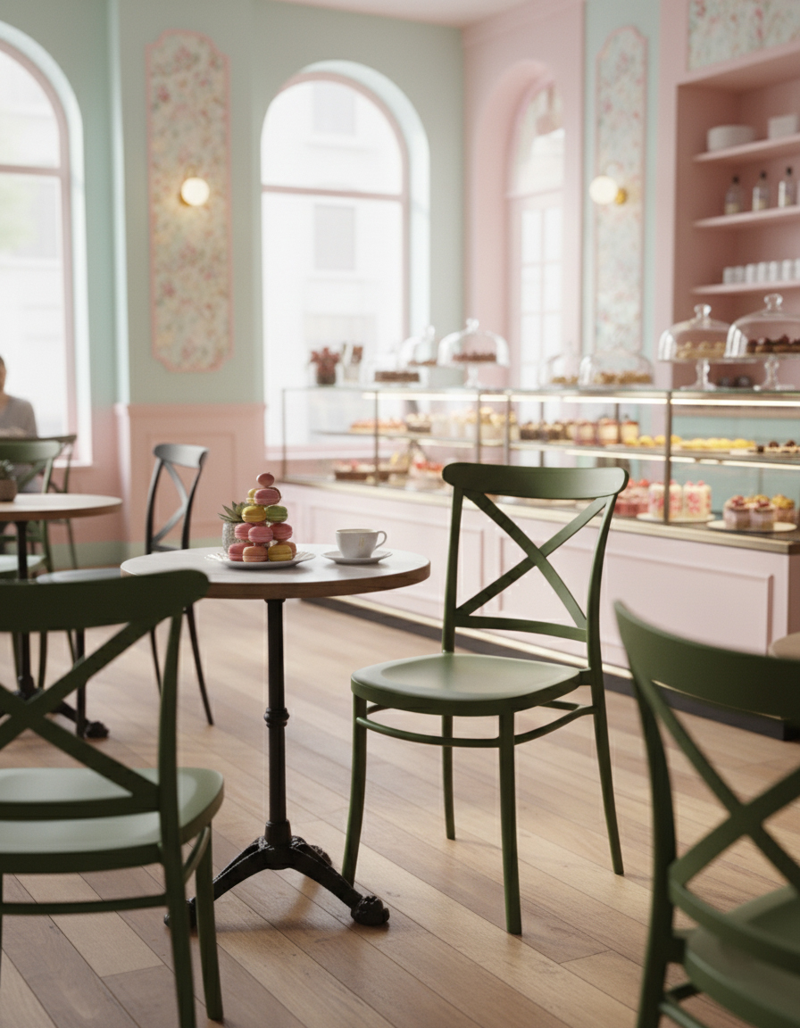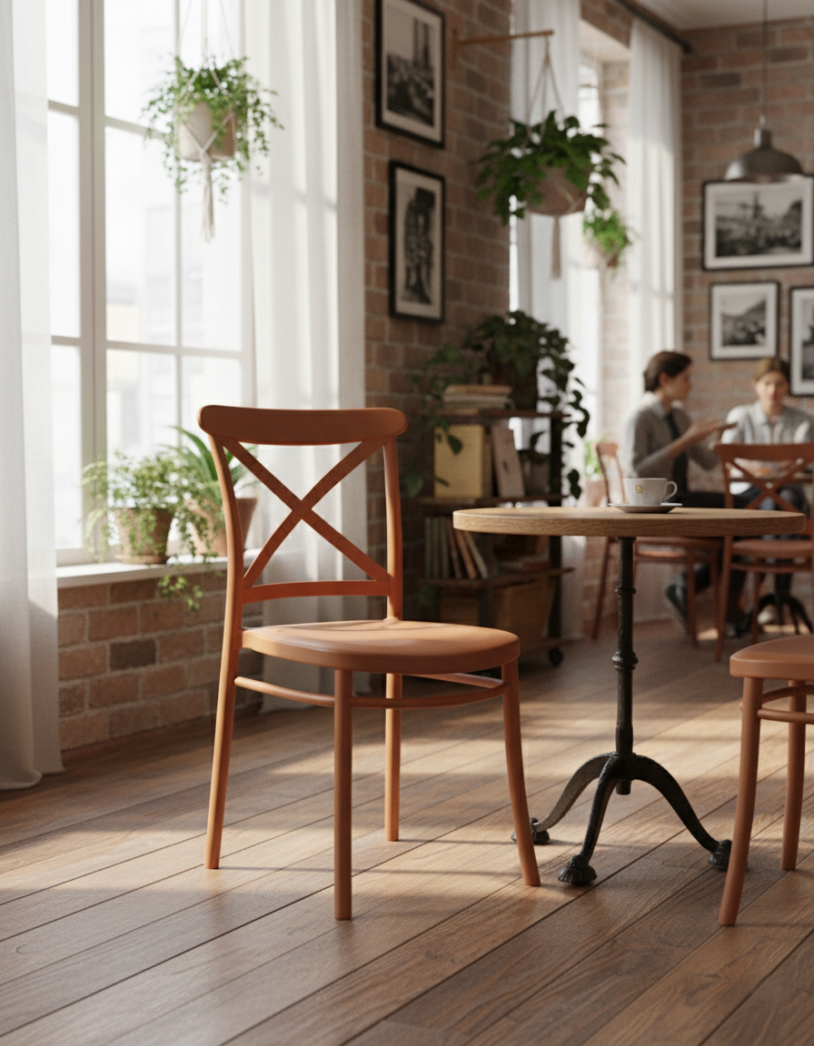Scaun versatil cu inspirație clasică și finisaj contemporan. Este potrivit atât pentru interior, cât și pentru exterior, păstrându-și aspectul impecabil în timp. Nuanța caldă conferă spațiului o atmosferă primitoare, fiind ideal pentru dining-uri, terase sau cafenele cu personalitate.